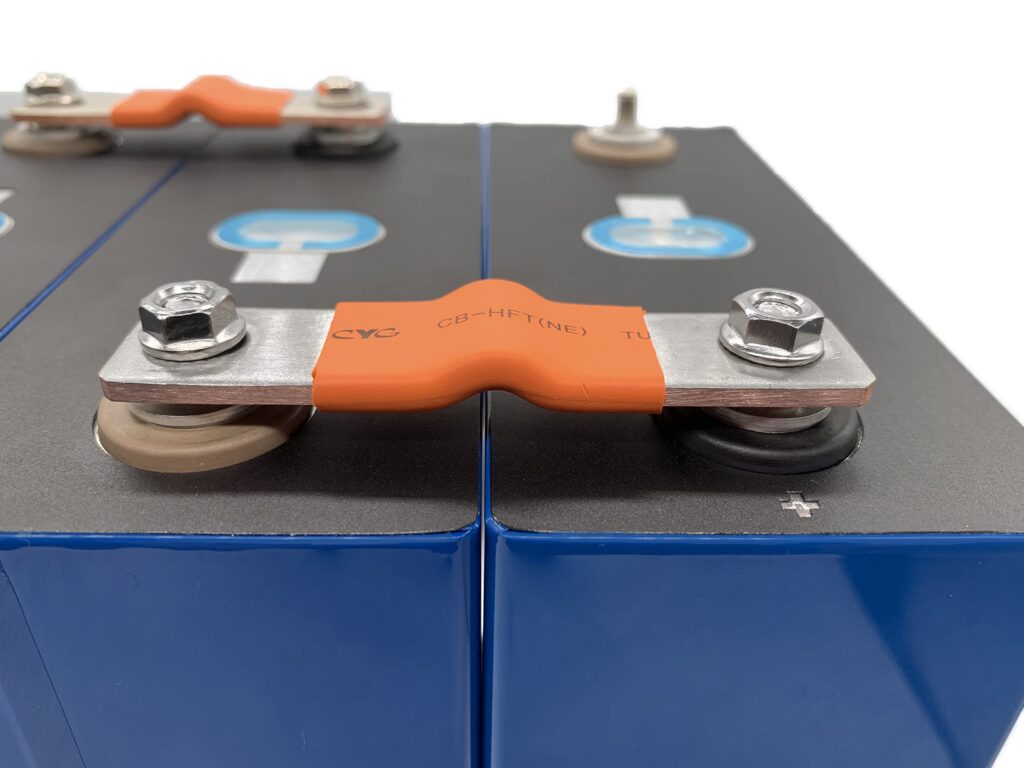 Ogniwa LiFePO₄ łączy się ze sobą za pomocą busbarów (najczęściej miedzianych lub aluminiowych).